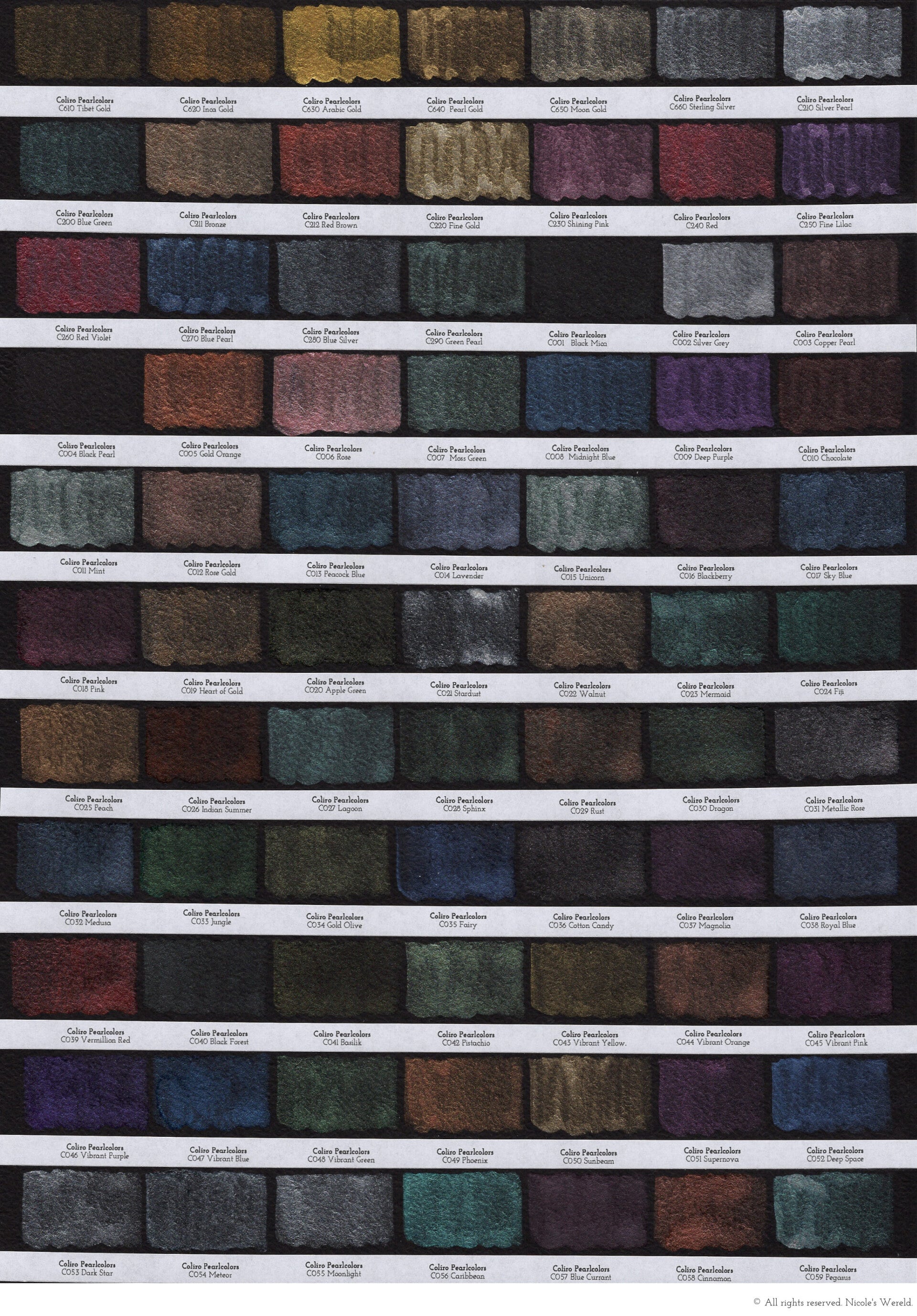 Je vindt de gehele kleurenrange van Coliro hieronder. Omdat de kleurenkaartjes zijn ingescand, kunnen de kleuren net anders uitvallen dan in het echt. Maar, ik heb mijn best gedaan om de kleurenkaartjes zo goed mogelijk te laten matchen met de realiteit. Metallic kleuren komen in een scan minder levendig over dan in het echt.