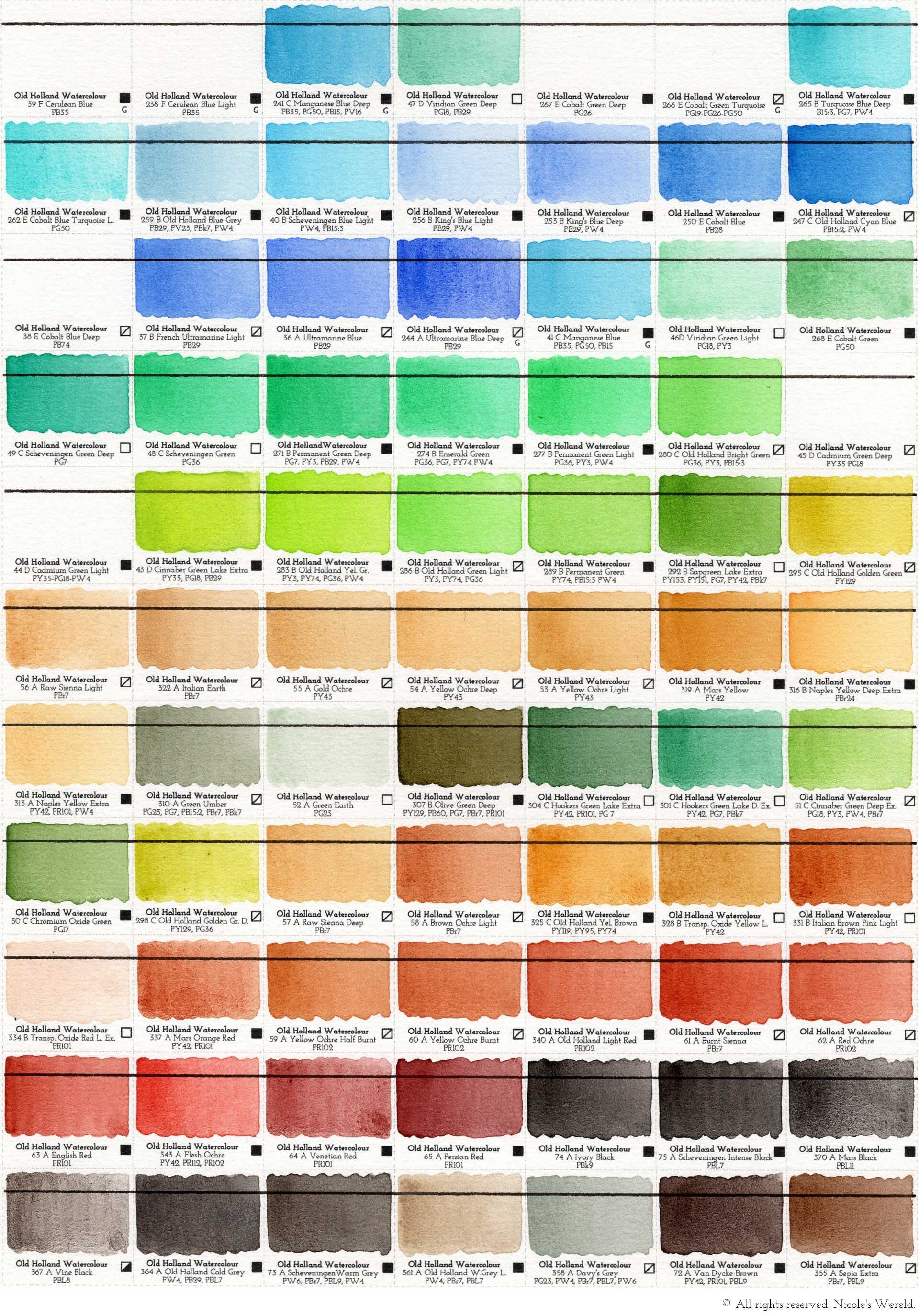 Je vindt de gehele kleurenrange van Old Holland hieronder. De kleurenkaart is ingescand en dus kunnen de kleuren net anders uitvallen dan in het echt.