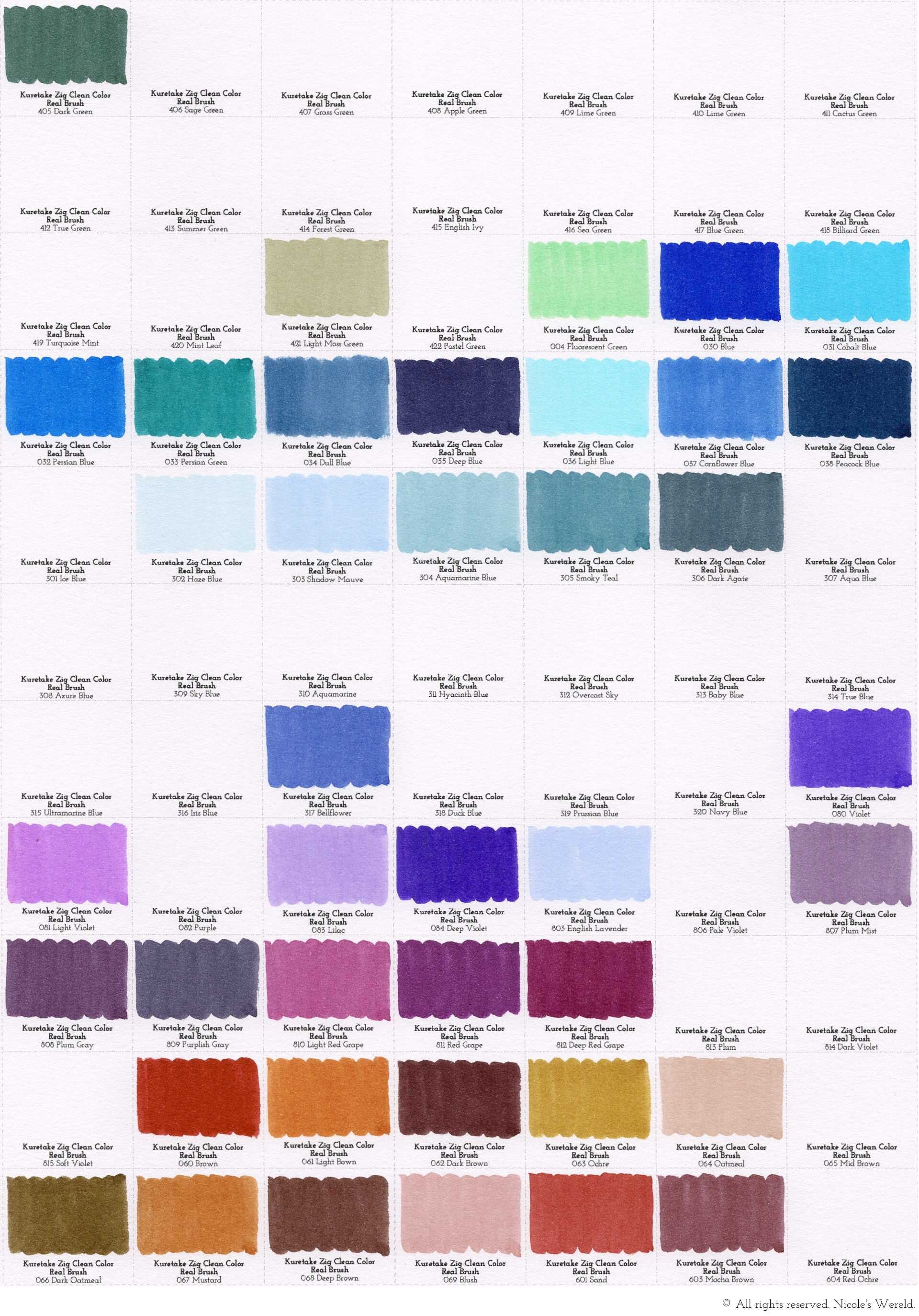 Je vindt een deel van de kleurenrange van Zig Clean Color Real brushpen hieronder. Omdat de kleurenkaartjes zijn ingescand, kunnen de kleuren net anders uitvallen dan in het echt. Ik heb mijn best gedaan om de kleurenkaartjes zo goed mogelijk te laten matchen met de realiteit.